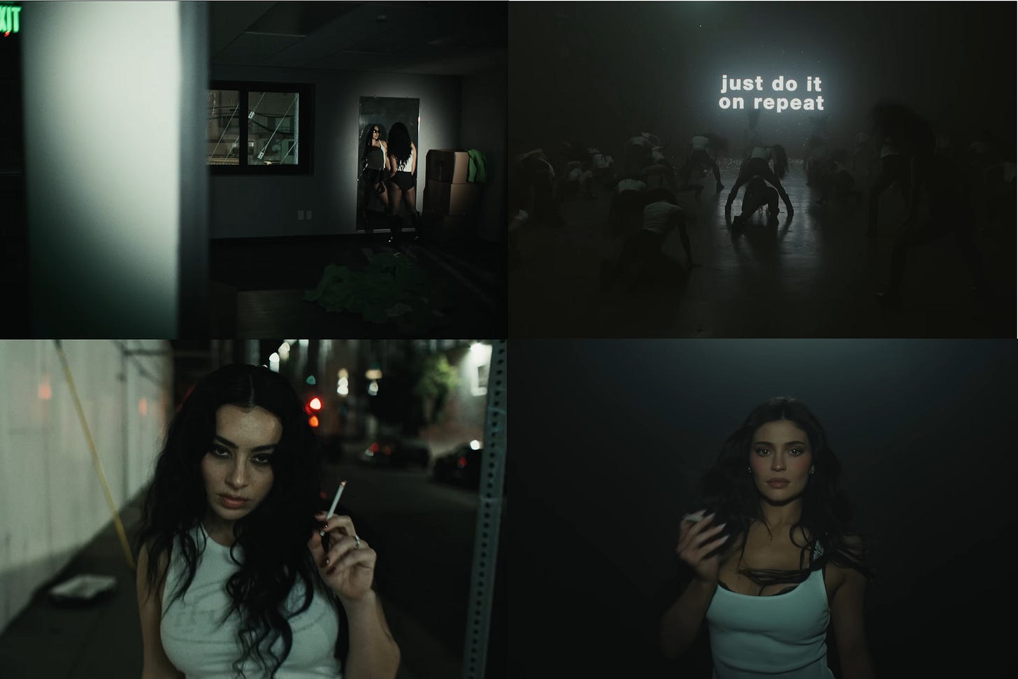 In a choreographed sequence for the Reputation-era track, “Look What You Made Me Do,” each back-up dancer embodies one of Swift’s eras while trapped in a glass box. This duplication is paralleled in the “Residue” video where it is clear that the essence of Charli’s ‘Brat era’ is an aesthetic and an ethic which, instead of raging against the glass cage of homogeneity, is meant to be lived through the mass (any one individual can dissolve into the regiment of ‘365 party girls’).